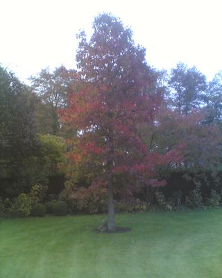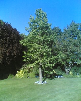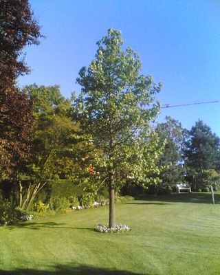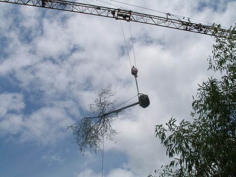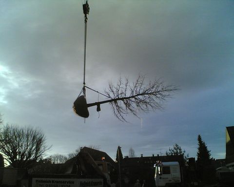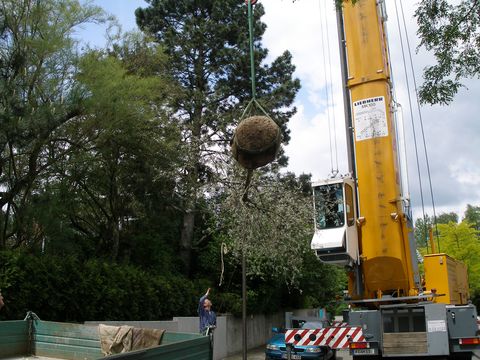 Was einst ein Pferdekarren leisten musste, wird in modernen Zeiten durch Hochleistungsmaschinen übernommen, in diesem Fall von Schwerlastkränen. Der hier abgebildete Liquidambar styraciflua – Amberbaum - mit einem Stammumfang von 60-70cm hatte ein Gewicht von etwa 2,8 Tonnen und musste über eine Strecke von etwa 40m Luftlinie verhoben werden. Schon im folgenden Spätsommer / Herbst wurde der Aufwand mit einer prächtigen Laubfarbe belohnt. Die etwas kleinere Pyrus salicifolia war aufgrund einer beengten Straßensituation und des noch weiteren Verhub nicht minder aufwändig. |