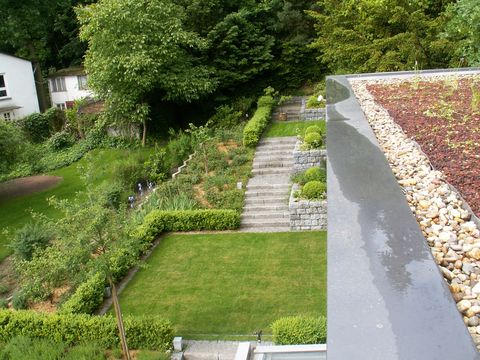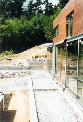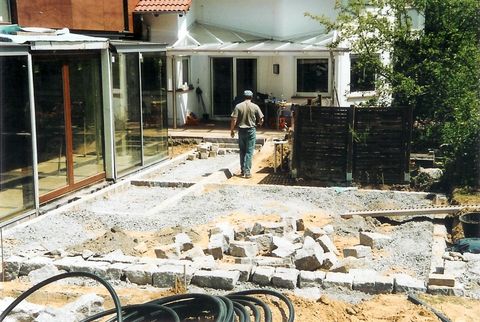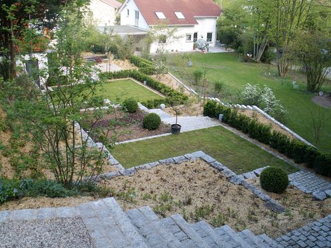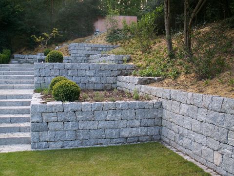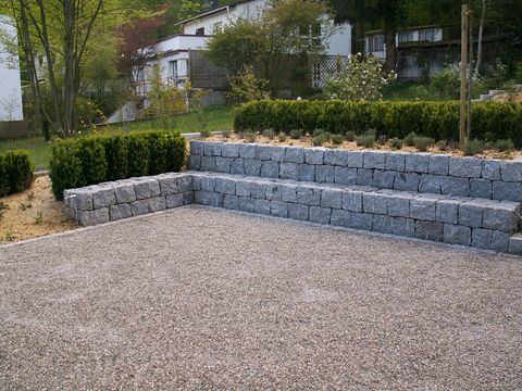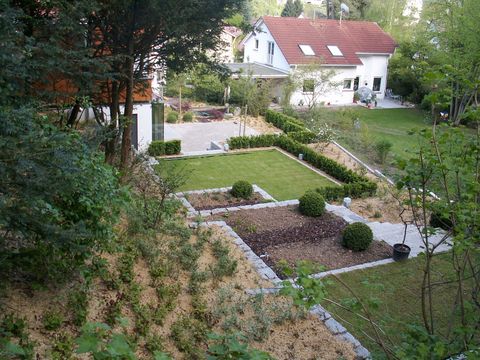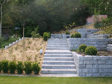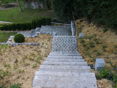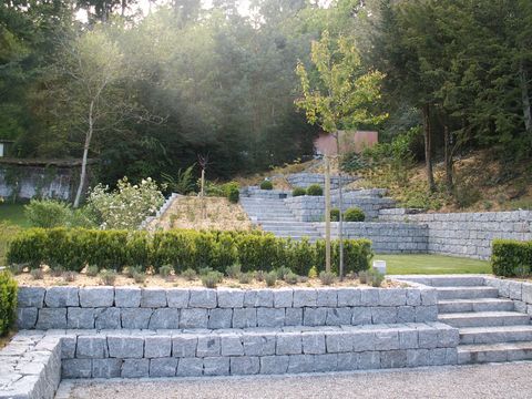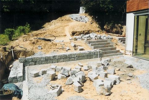 Im Jahr 2004 war eine Planung von Landschaftsarchitekt M. Altner umzusetzen, die einen massiven Einsatz von purer Muskelkraft erforderte. In eine steile Hangsituation wurden Terrassen und Wege in einen Hang ` hinein getrieben ´. Da Maschinen und Kräne nicht zum Einsatz kommen konnten, forderten so manche Baumaterialien, unter anderem ca. 30 to Granit Böschungspflaster den einen oder anderen Muskelkater. |